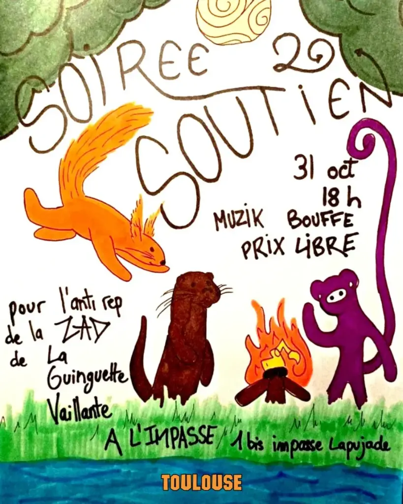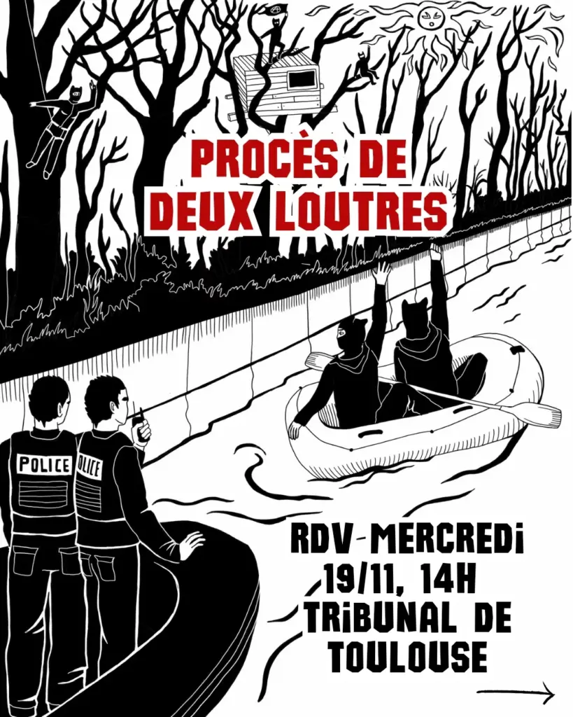 Lors de la cinquième expulsion de la ZAD de La Guinguette Vaillante, deux personnes venues en bateau gonflable pour protester ont été interpellées par la brigade fluviale après une intervention violente. Elles sont désormais poursuivies pour « violences sur agent ». Leur procès se tiendra le mercredi 19 novembre à 14h au tribunal de Toulouse […]