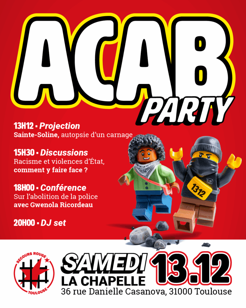 Le samedi 13 décembre prochain c’est l’ACAB Party à la Chapelle à Toulouse ! De 13h12 à 22h, une journée pour se rencontrer, discuter et s’organiser contre la police, l’État et leur système. Au programme : 13H12 · Projection Sainte-Soline, autopsie d’un carnage Avec des personnes ayant participé à la mobilisation 15h30 · Discussions Racisme […]