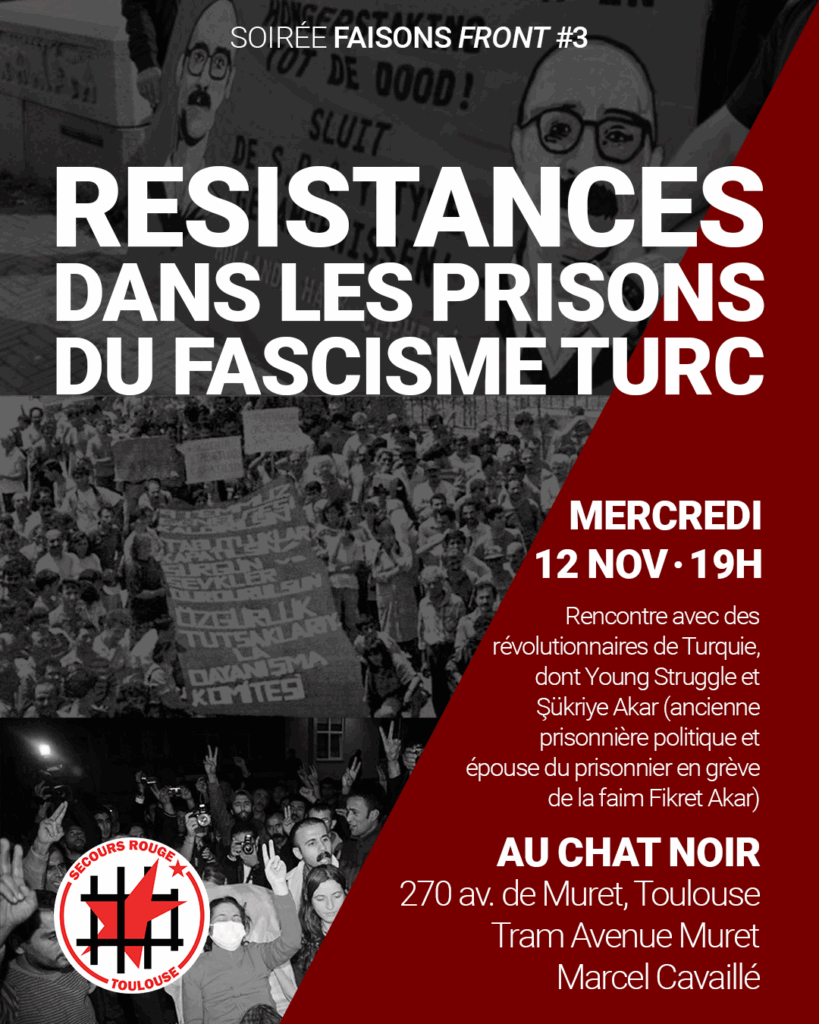 Mercredi 12 novembre au Chat Noir à Toulouse, une cinquantaine de personnes ont participé à la troisième édition de nos soirées mensuelles Faisons Front sur la lutte des révolutionnaires dans les prisons du fascisme turc. Après un retour sur l’histoire des résistances dans les prisons en Turquie, nous avons eu l’honneur d’écouter l’ancienne prisonnière politique […]
