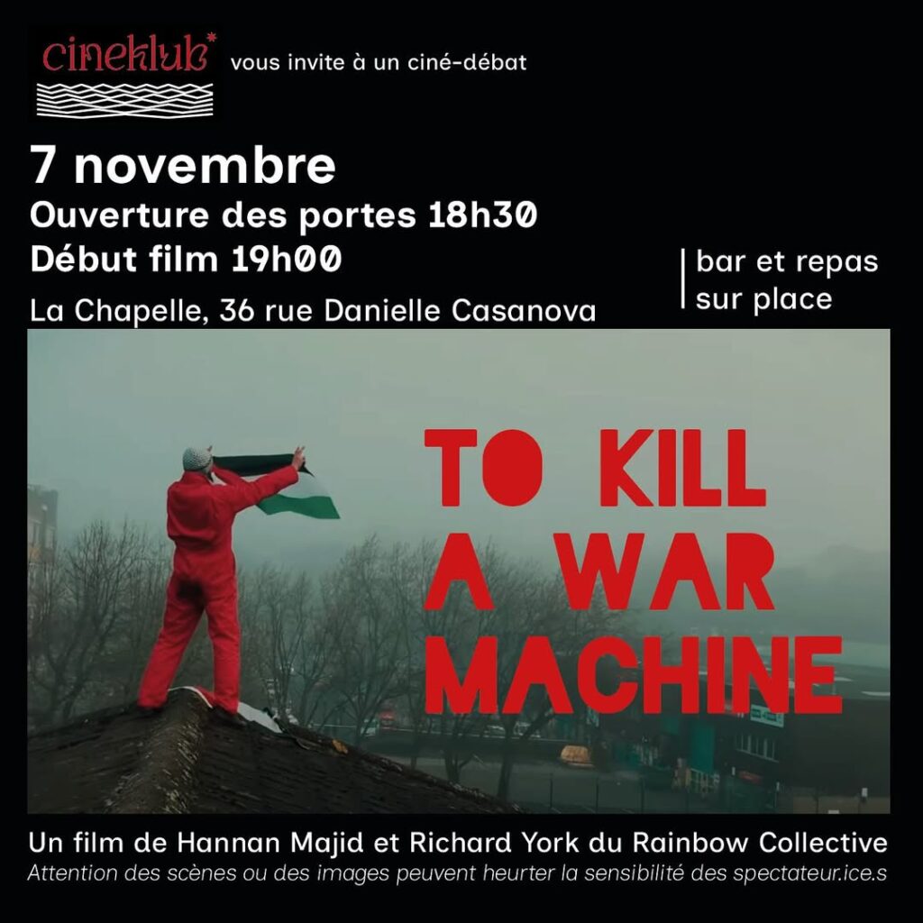 Le Cineklub anti-impérialiste organise son premier ciné-débat le vendredi 7 novembre dès 18H30 à la Chapelle (36 rue Danielle Casanova, Toulouse) à l’occasion de la projection du film « To kill a war machine » d’Hannan Majid et Richard York du Rainbow Collective. Le film retrace la mobilisation autour de Palestine Action, une campagne d’action directe britannique […]