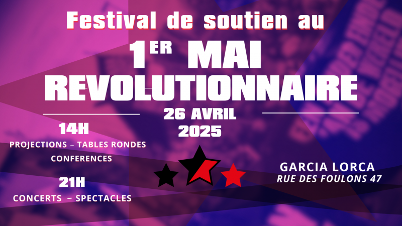 L’alliance du 1er Mai Révolutionnaire (site), dont fait partie le Secours rouge, organise ce samedi un festival de soutien. Ce sera une journée riche en rencontres, en échanges et en énergie collective. L’occasion parfaite de se retrouver, de s’organiser et de célébrer nos luttes dans une ambiance festive et combative.