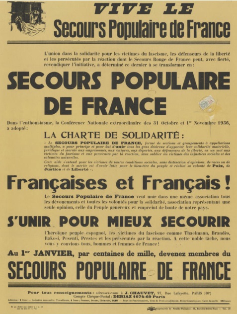 Le Secours rouge se transforme, en changeant à deux reprises sa dénomination au cours de l’année 1936. Optant dans un premier temps pour l’appellation « Secours rouge de France », en mars 1936, il devient à l’automne suivant le « Secours populaire de France et des colonies ». Le Secours populaire connaît un important développement et devient une véritable organisation de masse bénéficiant d’une forte base de masse – ses effectifs progressent de moins de 35 000 en 1933 à plus de 180 000 cinq ans plus tard.