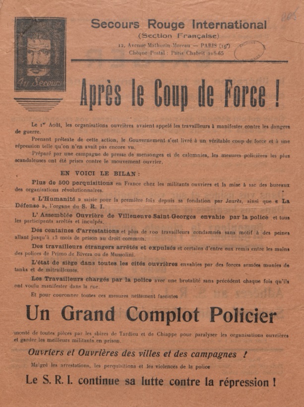 En France, L’Humanité annonce le 5 mai 1923 la fondation d’un « Comité de Secours rouge ». Constitué à l’initiative du Parti communiste et de la CGTU, il résulte de la fusion du Comité de secours aux réfugiés étrangers et du Comité pour les victimes du fascisme italien, nés quelques mois plus tôt. Il fonctionne d’abord sur le principe des adhésions collectives d’organisations, jusqu’à son premier congrès constitutif en mai 1925. La section française du SRI est ensuite réorganisée sur la base des adhésions individuelles, dont le nombre dépasse les 40 000 à la fin des années 1920.