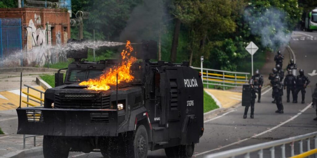 Mercredi 15 mai, vers 14 heures, des manifestations en deux endroits de Bogota : Carrera 12 et Calle 97 et Avenida Circunvalar et Calle 26C. C’est aux alentours de l’Universidad Distrital, dans le centre de la ville, que les affrontements ont opposé de jeunes manifestants aux forces anti-émeutes. Des cocktails Molotov et des trenades artisanales ont été lancées sur les forces de l’ordre. D’autres heurts ont eu lieu le même jour à Cali, et le lendemain à Bogota.