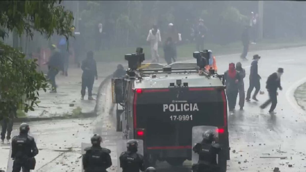 Le 9 juin est en Colombie la « Journée de l’étudiant tombé », en commémoration d’une marche d’étudiants qui a eu lieu en juin 1929 en protestation contre le gouvernement responsables du massacre des travailleurs des bananeraies en décembre 1928 (voir ici notre récit de cet événement). Au cours de cette marche, un étudiant en droit de l’Université nationale de Colombie, Gonzalo Bravo, a été tué par un soldat chargé de la sécurité du palais présidentiel. Ce jeudi, des manifestants cagoulés ont investi les locaux de l’Universidad Industrial de Santander à Bucaramanga. Ils ont allumé des fumièges, fait exploser des grenades artisanales et brisé quelques vitres (première photo). A Bogota, les manifestants étudiants de l’Université du district ont investi le campus de la Macarena, bloqué des routes, et se sont affronté aux formes anti-émeutes (seconde photo). D’autres manifestations et heurts ont eu lieu à Medellín, à Narino et à Cali.