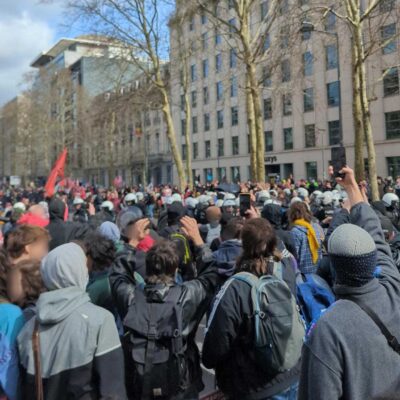 Bilan à 13h30 : 45 arrestations, au moins 2 manifestant·e·s emmené·e·s en ambulance. Le bloc arrive Porte de Hal.