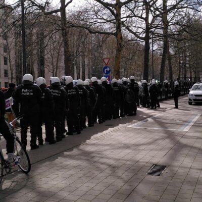 La police est stationnée partout aux abords du parcours avec des combis et des barricades. Notamment Zone Neutre, Madou, Botanique