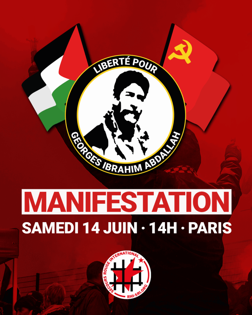 La manifestation annuelle (du 14 juin) pour la libération de Georges Abdallah revêt cette année une importance particulière, puisqu’une audience décisive pour sa libération se tiendra quelques jours plus tard – le 19 juin (voir notre article). C’est pourquoi, le Secours Rouge International sera présent et appelle à y participer largement (lire l’appel en intégralité ici).