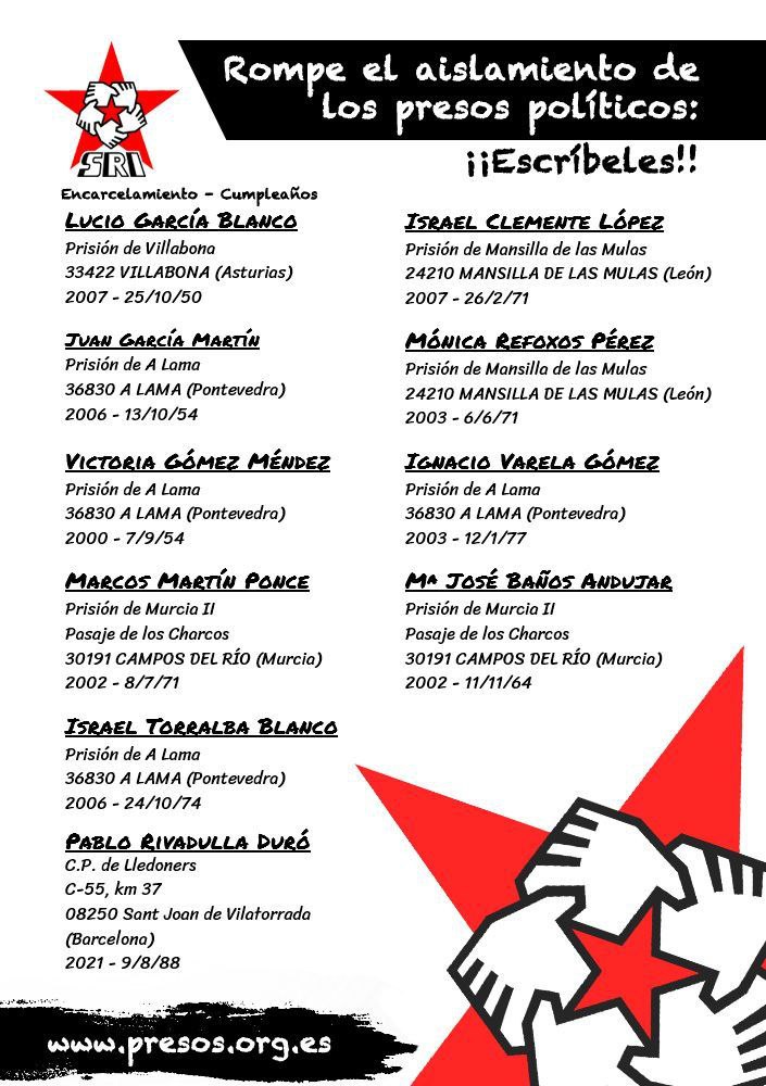 Les soutiens des prisonniers communistes et antifascistes toujours incarcérés appellent à leur écrire à l’occasion des fêtes de fin d’année. L’objectif est d’encourager la solidarité active par la correspondance, afin de briser l’isolement carcéral et de soutenir les prisonniers politiques. En particulier, ils invitent à écrire à Lucio García Blanco, Juan García Martín, Victoria Gómez Méndez, Marcos Martín Ponce, Israel Torralba Blanco, Pablo Rivadulla Duró, ainsi qu’Israel Clemente López, Mónica Refoxos Pérez, Ignacio Varela Gómez et Mª José Baños Andújar, détenus dans les prisons de Villabona, A Lama, Mansilla de las Mulas, Murcia II ou Lledoners.