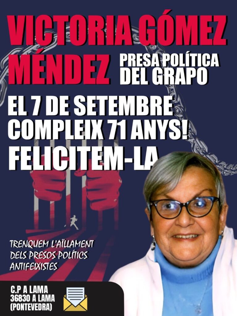 Ce 7 septembre, Victoria Gómez Mendez fêtera ses 71 ans derrière les barreaux. Militante du Parti Communiste d’Espagne (Reconstitué) – PCE(r) depuis 1975, elle rejoint en 1995 le Groupe de résistance antifasciste du premier octobre (GRAPO). Durant les années 80, 90 et 2000, elle est arrêtée et emprisonnée à plusieurs reprises par l’État espagnol et la France. Elle a été condamnée à plusieurs dizaines d’années de prison pour des actions revendiquées par les GRAPO. Afin de briser son isolement, ses soutiens appellent à lui écrire pour son anniversaire à cette adresse :