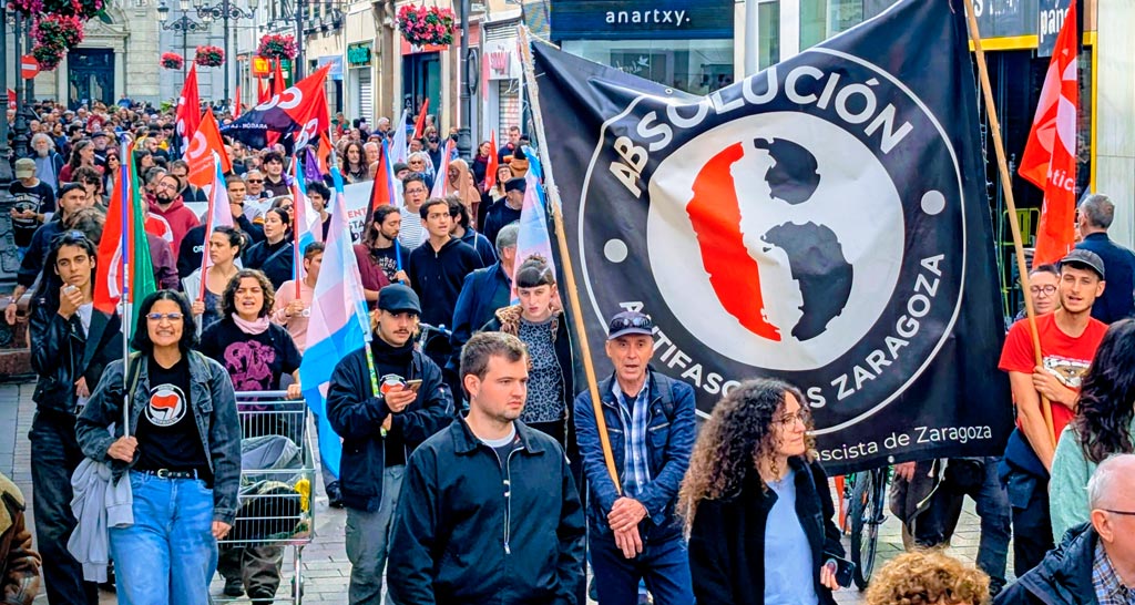 En janvier 2019, six jeunes (quatre majeurs et deux mineurs) ont été arrêtés à Saragosse lors d’une manifestation antifasciste contre un meeting de Vox. Ils ont été accusés de trouble à l’ordre public et d’atteinte à l’autorité. La justice leur a infligé des peines sévères : quatre ans et neuf mois de prison chacun, des amendes et des frais de justice pour un total de 200 000€, et de la probation pour les mineurs. Grâce à l’importante mobilisation, le gouvernement espagnol a amnistié deux d’entre eux le 23 septembre 2025 : Francisco Javier Aijón (« Javitxu ») et Adrián Latorre qui avaient déjà passé respectivement 491 et 526 jours en prison. Les deux autres prisonniers politiques antifascistes, Imad et Daniel, restent incarcérés sans qu’aucune explication ne justifie pourquoi la même mesure ne leur a pas été appliquée. Samedi 1er novembre, environ 1 000 personnes ont défilé pour leur libération dans le centre de Saragosse, répondant à l’appel de la plateforme « Liberté 6 de Saragosse », alors qu’une nouvelle manifestation est organisée le 20 novembre prochain par la Coordination antifasciste de la capitale aragonaise à l’occasion des 50 ans après la mort de Franco.