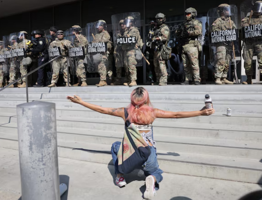 Quelque 700 Marines et 2000 réservistes supplémentaires ont été déployés à Los Angeles ce lundi 9 juin, après trois jours de violents affrontements entre des manifestants opposés à la politique migratoire de Donald Trump et les forces de l’ordre. L’opération en cours à Los Angeles porte le nom de Task Force 51, regroupe environ 2 100 gardes nationaux et 700 Marines d’active. Le déploiement de militaires d’active sur le territoire américain est une décision exceptionnelle, qui inquiète les défenseurs des droits civiques. Les manifestations ont débuté vendredi 6 juin à Los Angeles où réside une importante population hispanique, des personnes se sont interposées face aux arrestations musclées d’immigrés menées par la police fédérale de l’immigration (ICE) (notre article ici). Au matin du lundi 9 juin, plusieurs carcasses de voitures incendiées la veille sont visibles dans une artère de la ville, de nombreux messages hostiles à l’ICE, à la police et au président ont été tagués sur des bâtiments fédéraux. Les forces de l’ordre montent la garde à des carrefours et patrouillent dans le centre-ville déserté, elles ont déclaré un couvre-feu, interdisant les rassemblements pendant la nuit après des affrontements la veille au soir.