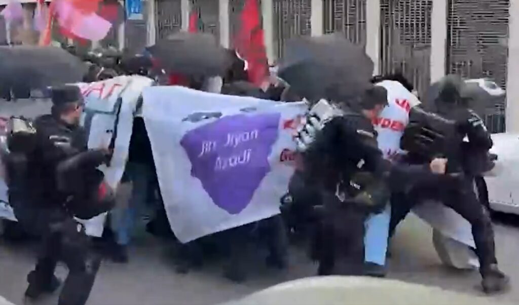 À Berlin, un bloc féministe pro-palestinien s’est fait attaquer par la police à coup de poing et de matraque.