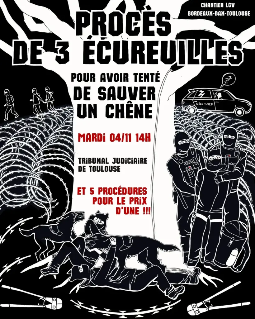 Le mardi 4 novembre, 3 personnes passeront au Tribunal de Toulouse pour avoir voulu défendre un chêne bicentenaire promis à l’abattage dans le cadre de la lutte contre la LGV Bordeaux-Toulouse. Alors qu’iels avaient subi une mesure de comparution immédiate apres 48h de GAV puis 2 nuits à la maison d’arrêt, le procès a finalement été renvoyé au 4 novembre, et en attendant iels ont été placé.es sous contrôle judiciaire lourd (voir notre article). Des courriers ont par ailleurs été envoyés par le Parquet aux employeurs de deux personnes, avant même l’audience, pour demander une suspension de leur travail. Pas moins de 5 procédures seront jugées dont des faits reprochés durant une manifestation de 2024, comme : « installation en réunion sur un terrain privé en vue d’y habiter » (écureuillage), « destruction en réunion », « violences », refus de de prélèvement ADN. Afin de les soutenir, un rassemblement est organisé le mardi 4 novembre à 14h au Tribunal Judiciaire de Toulouse.