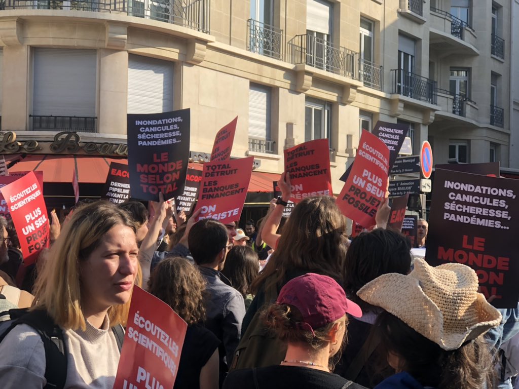 Vendredi 26 mai, plusieurs centaines de manifestants se sont assis par terre devant les deux côtés de la salle Pleyel à Paris pour bloquer l’arrivée des actionnaires de TotalEnergies, qui veulent se rendre à l’assemblée générale du groupe. À chaque fois qu’un actionnaire arrivait, les militants faisaient en sorte de ne pas le laisser passer. Les forces de police ont voulu mettre fin à ce blocage, ce qui a provoqué des affrontements. Des gaz lacrymogènes ont été lancés par les policiers, qui ont donné aussi quelques coups de matraque et procédé à au moins une arrestation. Les actionnaires de la compagnie ont été invités par le conseil d’administration à voter à cette assemblée contre une résolution visant à renforcer ses engagements climatiques. Celle-ci propose d’aligner davantage les objectifs de TotalEnergies sur l’accord de Paris pour 2030, visant à contenir le réchauffement climatique sous les 2 °C par rapport aux niveaux préindustriels.