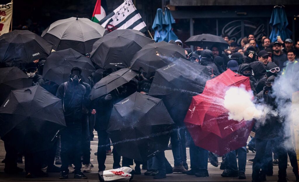 Des manifestations ont eu lieu partout en France mercredi à l’occasion du 1ᵉʳmai, avec des revendications diverses portées par les syndicats pour les salaires, les retraites, et contre le génocide à Gaza. Il y a eu des affrontements à Rennes, à Nantes (photo) et à Lyon où au moins 22 personnes ont été interpellées. À Paris, la manifestation s’est élancée peu après 14h00 de la place de la République vers la Nation. De premières tensions ont eu lieu mercredi en tête du cortège et les forces de l’ordre ont fait usage de gaz lacrymogène. À 14h40, 917 personnes avaient été contrôlées selon la préfecture, faisant état de 25 interpellations.