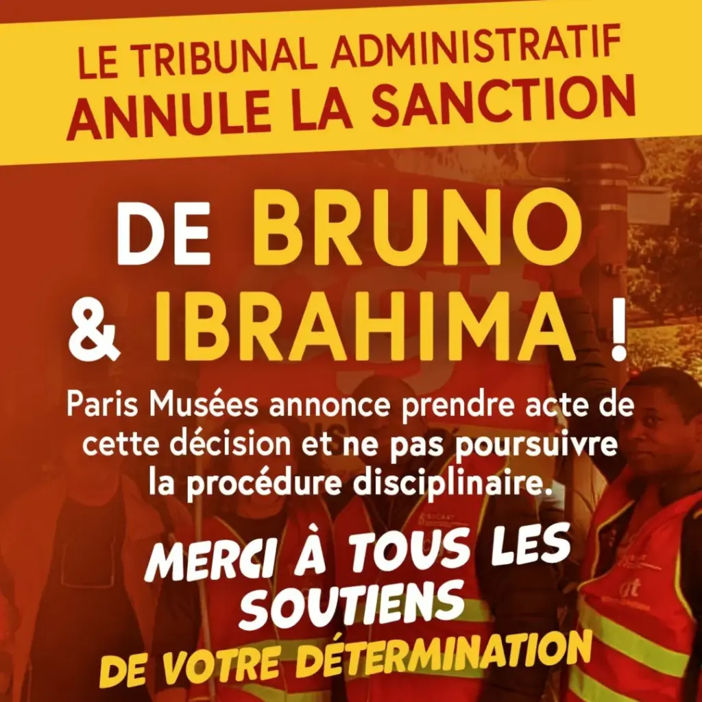 Le tribunal administratif a définitivement annulé les sanctions disciplinaires visant Bruno et Ibrahima, agents de Paris Musées, après en avoir déjà suspendu l’exécution, mettant fin à une procédure engagée depuis deux ans. Ces sanctions, liées à des accusations internes dont le caractère discriminatoire et raciste a été dénoncé par leurs soutiens syndicaux, ont été jugées infondées par la justice administrative. La Ville de Paris et Paris Musées ont pris acte de la décision, renoncé à toute poursuite disciplinaire et annoncé le remboursement des salaires non perçus. La CGT salue une victoire obtenue grâce à la mobilisation collective, la détermination des deux agents et les nombreux soutiens.