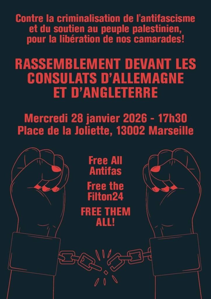 Un rassemblement est appelé à Marseille le mercredi 28 janvier 2026 à 17h30, place de la Joliette, devant les consulats d’Allemagne et d’Angleterre, contre la criminalisation de l’antifascisme et du soutien au peuple palestinien. L’initiative met en avant la solidarité avec les camarades emprisonné·es et poursuivi·es dans plusieurs pays européens, notamment dans les affaires liées aux mobilisations antifascistes et aux actions contre la guerre, avec les mots d’ordre « Free All Antifas » et « Free the Filton24 ». L’appel vise à dénoncer la répression transnationale et à affirmer un soutien politique aux personnes poursuivies, en faisant du rassemblement un point de convergence local contre le durcissement autoritaire en cours.