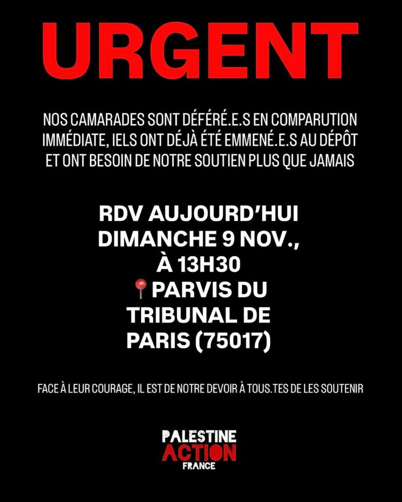 Le jeudi 6 novembre, à la Philharmonie de Paris, quatre activistes pro-palestiniens ont été interpellés après avoir tenté de perturber le concert de l’Orchestre philharmonique d’Israël, un événement largement dénoncé comme une opération de normalisation du génocide en Palestine (voir notre article). Cette action a été violemment attaquée par des sionistes dans la salle et par une large campagne médiatique des partisans d’Israël. Après avoir passé 48 heures en garde à vue, les quatre militants sont présentés au tribunal en comparution immédiate ce dimanche 9 novembre. Face à cette situation, l’organisation Palestine Action France a lancé un appel à un rassemblement de soutien devant le tribunal. Le rassemblement est prévu ce dimanche 9 novembre, à partir de 13h30, sur le parvis du Tribunal de Paris.