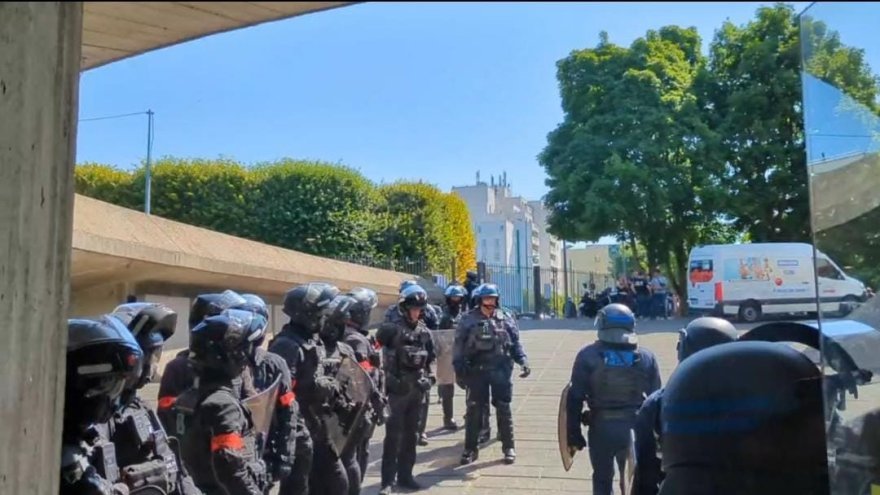 « Salon du Bourget: marchands de mort », « Leurs guerres, leurs profits, nos mort-e-s, stop au génocide en Palestine » faisaient partie des mots d’ordre du rassemblement, qui a servi de départ à une manifestation de 4000 personnes, ce samedi 21, devant la bourse du travail de Bobigny, dans le cadre du week-end de mobilisation contre le salon international de l’aéronautique et de l’espace organisé au Bourget, à 9 km au nord de Paris. Cette manifestation a eu lieu après plusieurs épisodes répressifs que nous avons évoqué hier (voir ici).