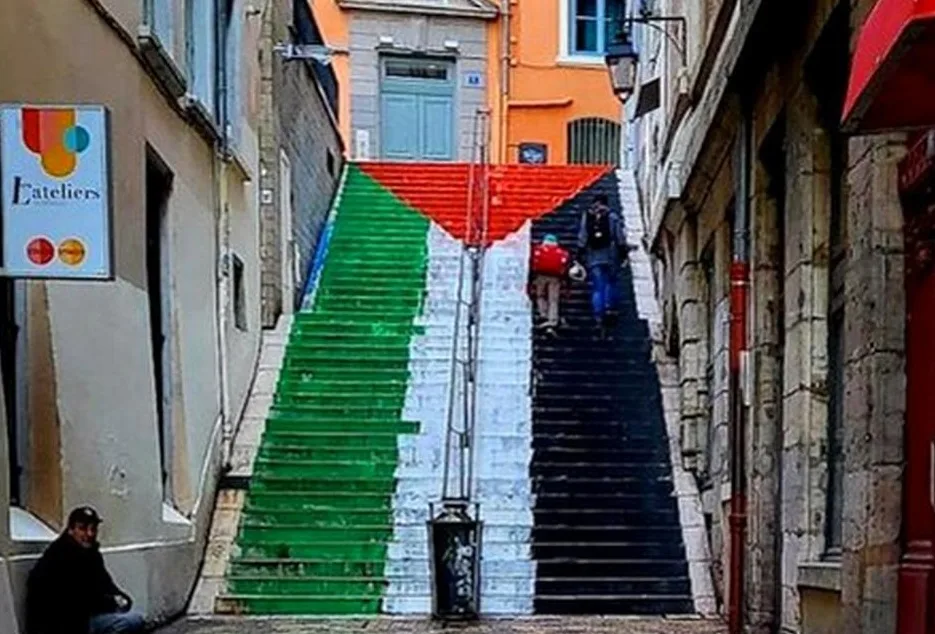 Dans la nuit du dimanche 11 au lundi 12 février, les marches de l’escalier de la rue Sainte Marie des Terreaux, à Lyon, ont été repeintes aux couleurs de la Palestine, pour visibiliser l’horreur du génocide pratiqué par l’armée d’occupation israélienne. Six militant.es ont été pris sur le fait et mis en garde à vue et trois ont subi des perquisitions immédiates (ce qui est illégal, car les règles de mises en garde à vue ne s’appliquent normalement pas à ce genre de délit). Une directive ministérielle est d’ailleurs appliquée : chaque action concernant la Palestine doit conduire, autant que possible, à une garde à vue, dans le but d’intimider.