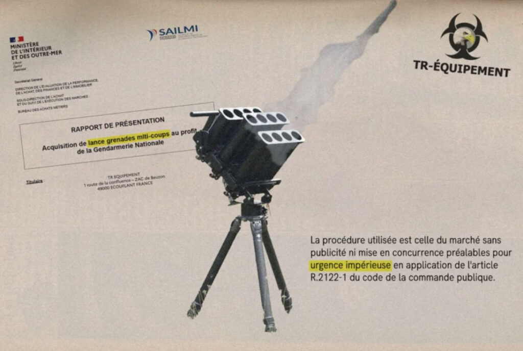À 17 000 km, l’arme a déjà été utilisée le 8 juin, alors que des affrontements en Kanaky ont lieu depuis un mois ( voir article ici,  ici et ici ) Lors d’un barrage installé par la gendarmerie devant l’aéroport de La Tontouta, sur un trépied prévu pour recevoir appareils photo et caméras, le nouveau lanceur renforce leur dispositif.