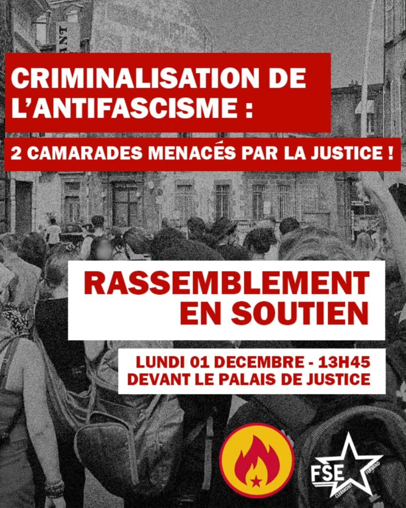 Le lundi 1ᵉʳ décembre à Clermont-Ferrand, deux militants doivent comparaître en justice pour leur présumée participation au saccage du local du Bastion Social, un groupuscule d’extrême droite. Sept ans après les faits, la justice a refusé la prescription dans ce dossier. Afin de les soutenir, un rassemblement est organisé le même jour dès 13H45 devant le Palais de Justice clermontois.