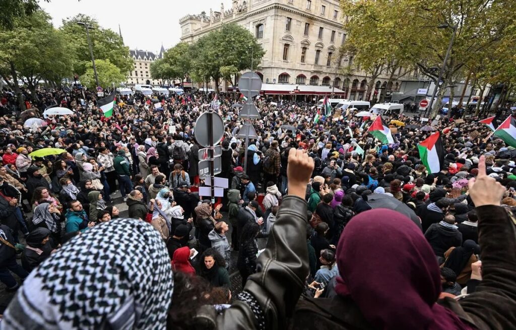 Malgré l’interdiction du rassemblement, des milliers de personnes se sont retrouvées à Paris ce samedi 28 octobre pour exprimer leur soutien au peuple palestinien. Les forces de l’ordre ont nassé 3 000 à 4 000 manifestants place du Châtelet. 1 359 personnes auraient écopé d’une amende de 135 euros pour participation à une manifestation interdite. 21 personnes ont également été interpellées. Les tentatives de partir en manifestation ont été réprimées par les forces de l’ordre qui ont fait usage notamment de grenades lacrymogènes. Le rassemblement avait été interdit à Paris en raison d’un risque de troubles à l’ordre public, décision validée par le tribunal administratif ce samedi matin. À Nice, Lyon et Montpellier, plusieurs centaines de personnes sont aussi descendues dans les rues alors que les manifestations avaient cette fois été interdits par la préfecture. A Londres, 100 000 personnes ont manifesté pour la Palestine.