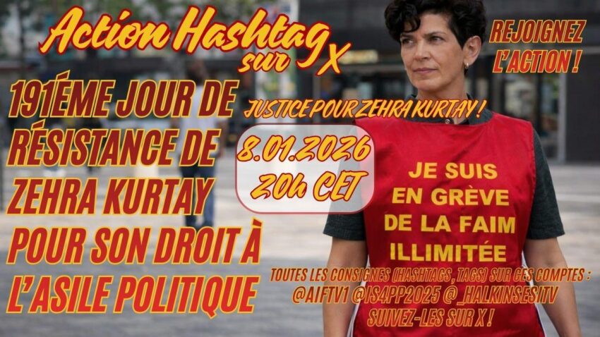 La militante révolutionnaire Zehra Kurtay est en grève de la faim depuis le 3 juillet 2025 pour le rétablissement de son titre de séjour en France (voir notre article). Sa situation administrative sera à nouveau examinée le 12 janvier, dans le cadre de son troisième procès contre la préfecture, qui a fait appel de deux verdicts favorables précédents. Cette audience doit statuer sur son titre de séjour, délivré en France par la préfecture pour des durées variables, mais la reconnaissance officielle de réfugiée et la protection contre l’expulsion ne sont accordées qu’après décision d’Ofpra. Le processus a été retardé depuis le 15 décembre, et sa deuxième demande auprès d’Ofpra a été annulée. Des avocats et associations appellent les autorités et la justice à accélérer la procédure, compte tenu de l’urgence de sa situation médicale, en organisant un rassemblement devant l’OFPRA le 8 janvier à 11 h (201 rue Carnot, Bâtiment A, Fontenay-sous-Bois) et un autre devant la Cour administrative d’appel de Paris le 12 janvier à 10 h (86 rue François Miron). Parallèlement, un appel est lancé pour un twitterstorm sur X le 8 janvier à 20 h (voir photo).