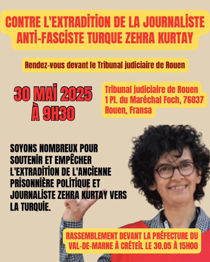 Militante révolutionnaire turque et ancienne prisonnière politique en Turquie et en France, Zehra Kurtay a été arrêtée le 26 mai dernier en région parisienne. Elle est actuellement détenue au Centre de Rétention Administrative d’Oissel et a entamé une grève de la faim. Elle est aujourd’hui sous la menace d’une expulsion vers le régime fasciste turc où sa vie est en danger en raison de son engagement antifasciste et internationaliste. Vendredi 31 mai, une audience du Tribunal judiciaire de Rouen aura lieu pour statuer sur sa situation. A cette occasion, les soutiens de Zehra Kurtay appellent à se rassembler dès 9h30 devant le tribunal (1 place du Maréchal Foch à Rouen).
