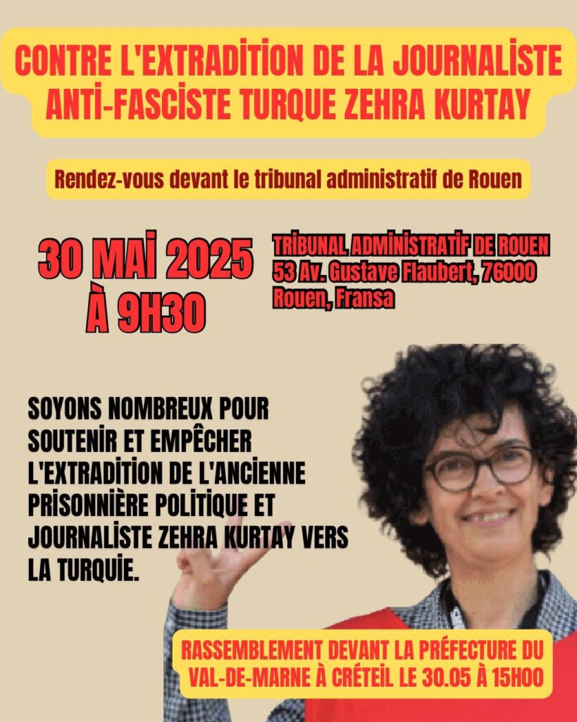 Militante révolutionnaire turque et ancienne prisonnière politique en Turquie et en France, Zehra Kurtay a été arrêtée le 26 mai dernier en région parisienne. Elle est actuellement détenue au Centre de Rétention Administrative d’Oissel et a entamé une grève de la faim. Elle est aujourd’hui sous la menace d’une expulsion vers le régime fasciste turc où sa vie est en danger en raison de son engagement antifasciste et internationaliste. Vendredi 31 mai, une audience du Tribunal judiciaire de Rouen aura lieu pour statuer sur sa situation. A cette occasion, les soutiens de Zehra Kurtay appellent à se rassembler dès 9h30 devant le tribunal (1 place du Maréchal Foch à Rouen).
