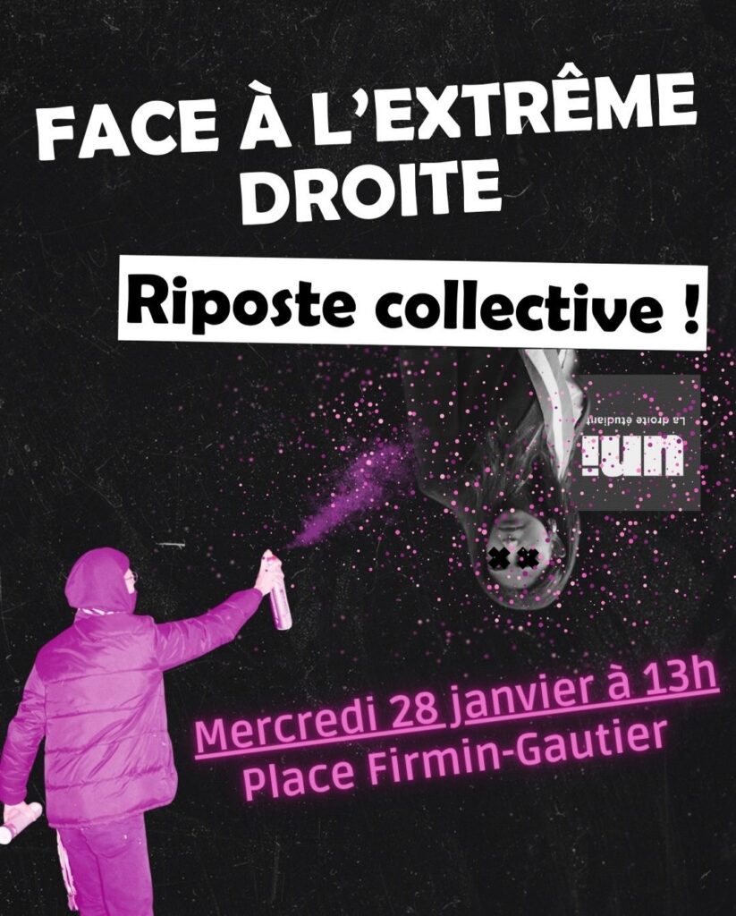 À la suite d’une manifestation le 28 mars 2024 contre la venue de la députée d’extrême droite Hanane Mansouri à l’Université Grenoble Alpes (UGA), un militant antifasciste est convoqué devant la justice le 28 janvier à 13h au Tribunal Judiciaire de Grenoble. Ses soutiens dénoncent une interpellation violente par la BAC ayant entraîné 10 jours d’ITT, ainsi qu’une plainte déposée par le syndicat étudiant de droite UNI pour l’usage d’un « spray à paillettes ». Une large coalition d’organisations syndicales et politiques appelle à un rassemblement de soutien place Firmin-Gautier le même jour à la même heure pour dénoncer ce qu’ils considèrent comme une criminalisation de l’action militante et une montée de l’extrême droite sur les campus.