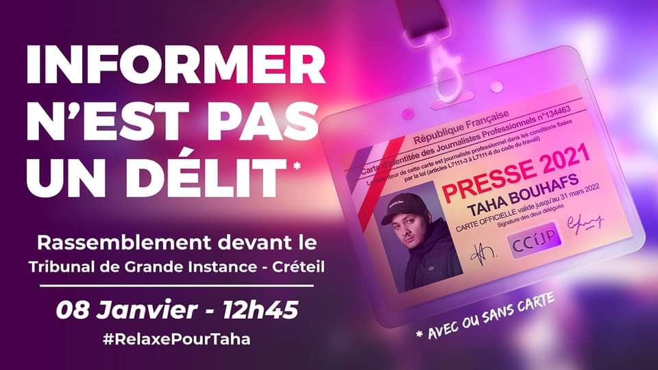Le 12 juin 2019 lors d’un reportage sur une grève de travailleurs sans-papiers, le journaliste Taha Bouhafs a été agressé par un agent de la BAC pour avoir refusé d’arrêter de filmer. Suite à cela, le policier a déposé plainte contre le journaliste pour « outrage et rebellion ». Vendredi 8 janvier, un rassemblement de soutien est organisé par Reporters en colère pour exiger la relaxe de Taha Bouhafs à 12H45 au Tribunal de Grande Instance de Créteil.