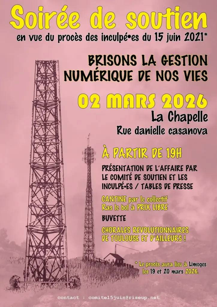 Le comité de soutien aux inculpé·es du 15 juin 2021 organise une soirée d’information et de solidarité le 2 mars à La Chapelle, à Toulouse. Cette affaire concerne une série d’arrestations liées à l’incendie de huit véhicules d’ENEDIS et de deux antennes-relais de téléphonie et télévision (voir notre article), et les prévenus seront jugés pour « destruction ou dégradation de biens par moyens dangereux » et « association de malfaiteurs ». La soirée inclut une présentation de l’affaire et de ses enjeux, un repas chaud à prix libre à 20h et une chorale révolutionnaire à 20h30.