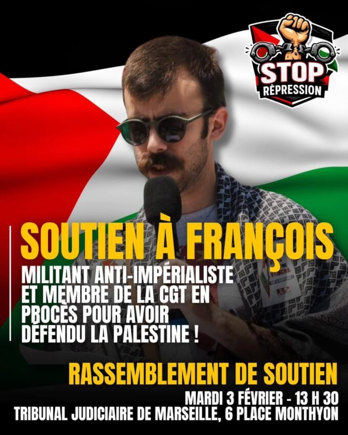 François, militant anti-impérialiste et membre de la CGT, fait l’objet de poursuites judiciaires suite à la diffusion d’un tract au sein de son université. Le document en question dénonçait les liens entre l’établissement universitaire et des entreprises accusées de complicité dans le cadre du génocide à Gaza. Face à cette répression politique et syndicale, un rassemblement de solidarité est organisé pour défendre la liberté d’expression et soutenir les militants engagés pour la cause palestinienne ce mardi 3 février dès 13H30 au Tribunal de Marseille (6 place Monthyon).