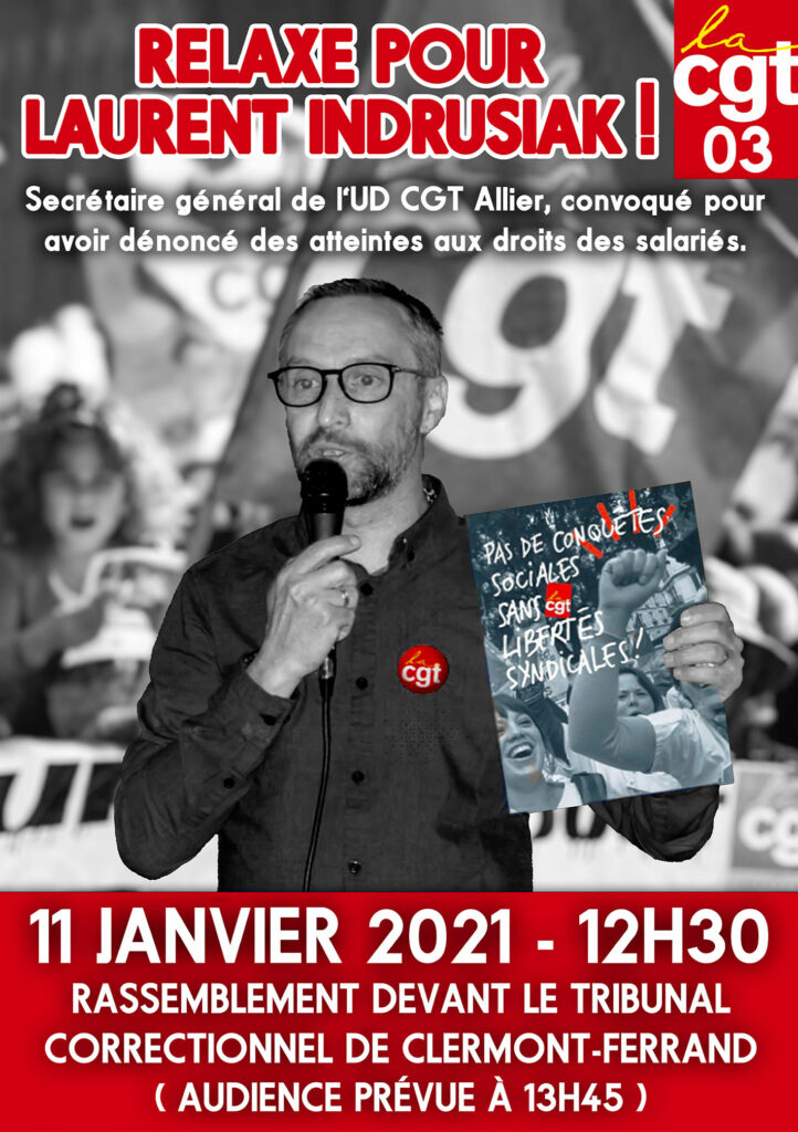 Laurent Indrusiak, secrétaire général de l’UD CGT 03, est convoqué au tribunal correctionnel de Clermont-Ferrand le 11 janvier 2021 pour répondre à des accusations « d’injures » à destination de La Poste et de cadres de La Poste dans le cadre d’une mobilisation d’agents postaux du département. Ces six dernières années, il a été convoqué à 15 reprises au commissariat et c’est son troisième procès. L’Union Départementale CGT de l’Allier appelle à un rassemblement de soutien le 11 janvier à partir de 12h30 devant le tribunal correctionnel de Clermont-Ferrand.
