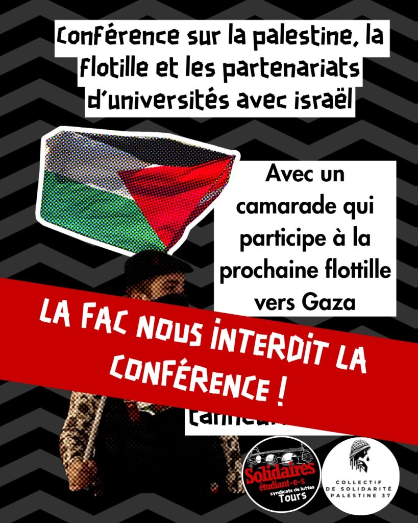Le 2 avril, à Université de Tours, une conférence organisée par Solidaires Étudiant-e-s Tours et le Collectif Solidarité Palestine 37 a été interdite par la présidence de l’établissement. L’événement devait porter sur les liens entre universités françaises et israéliennes ainsi que sur le partenariat avec STMicroelectronics, avec la participation d’une personne engagée dans le prochain départ d’une flottille de soutien à Gaza. Les organisateurs dénoncent une tentative de museler le soutien à la Palestine et ont appelé à un rassemblement en réaction, soutenus par plusieurs organisations étudiantes et syndicales.