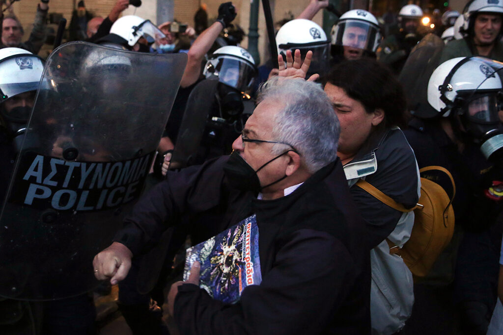 Des policiers ont violemment dispersé les enseignants qui protestaient près du parlement grec lors d’un rassemblement organisé par les syndicats d’enseignants dans le centre d’Athènes, le 6 octobre. Les enseignants des écoles publiques protestent contre l’évaluation obligatoire du personnel enseignant décidée par le ministère grec de l’Éducation.