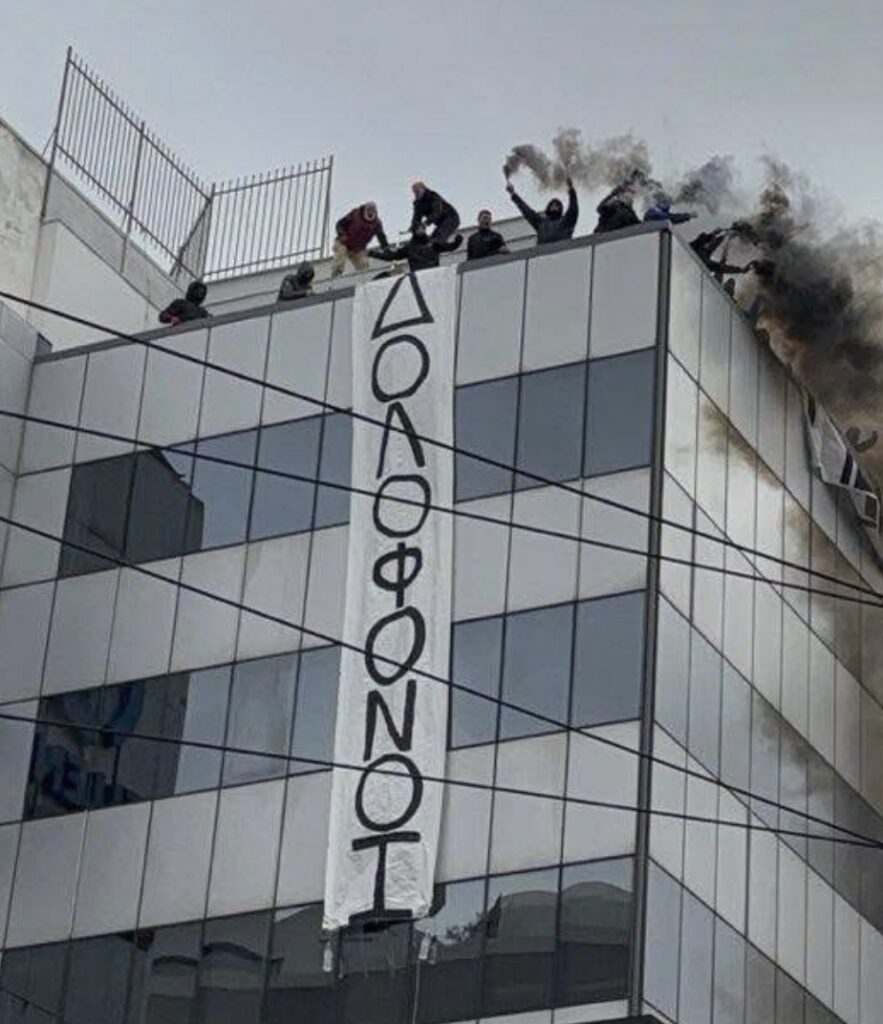 25 membres de Rouvikonas, un collectif anarchiste, ont été arrêtés à Athènes ce vendredi lors de la grève générale de 24h ( voir article ici ). Alors qu’ils étaient présentés au  tribunal en comparution directe ce samedi, le procès a été ajourné. C’est sans précédent, les militants seront maintenus en prison jusqu’à mardi, date à laquelle le procès se poursuivra. Vendredi, alors que toutes les polices surveillaient la marée humaine dans la capitale, le collectif est monté ou au sommet de l’immeuble de « Hellas train », une compagnie de train privatisée qui cherche à faire le maximum de profits au détriment de la sécurité des voyageurs. Ils ont déployé sur la façade de l’édifice deux banderoles en lien avec la catastrophe ferroviaire du 28 février 2023 ayant fait 57 morts, l’une mentionnait « Assassins » et la seconde « On ira jusqu’au bout Koulis » (Koulis est le diminutif du premier ministre Mitsotakis). Après avoir entendu la décision du tribunal, la foule venue les soutenir s’est bruyamment révoltée et a aussitôt été chargée par la police anti-émeutes.