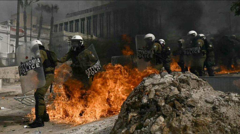 Sur l’ensemble du territoire, plus de 325.000 personnes se sont rassemblées, cela dépasse largement les manifestations qui ont eu lieu après l’accident ferroviaire du 28 février 2023 dans lequel 57 personnes ont perdu la vie et les manifestations suivantes toutes réprimées par les forces de l’ordre ( voir article ici ). En cette journée de grève générale de 24h très suivie, les transports ont été à l’arrêt, les écoles, les universités et les administrations sont restées fermées. Dans le centre d’Athènes, la plupart des magasins et cafés ont baissé leur rideau en signe de solidarité.