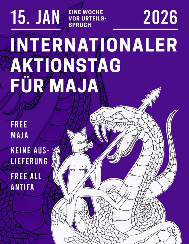 Le 15 janvier 2026, une journée internationale de solidarité est organisée en soutien à l’antifa Maja qui est en détention depuis plus de 530 jours en Hongrie dans le cadre de l’affaire de Budapest. Le 22 janvier prochain, le verdict concernant son procès sera rendu (voir notre article). Ce jugement pourrait ouvrir la voie à de futures extraditions vers la Hongrie. Les organisateurs appellent à des manifestations et actions pour exiger la libération immédiate de Maja et de tous les antifascistes accusés.