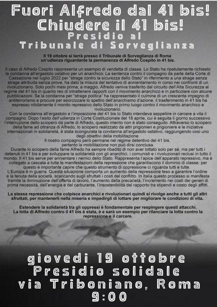Le 19 octobre, au Tribunal d’application des peines de Rome, aura lieu une audience concernant l’enfermement d’Alfredo en régime 41-bis. L’État, par le biais du parquet de Turin, a demandé à plusieurs reprises sa condamnation à l’emprisonnement à perpétuité avec période de sûreté illimitée. La Cour de Cassation avait émis en juillet 2022 une condamnation contre Alfredo pour un « attentat-massacre »… sans victime. Quelques mois auparavant, Alfredo Cospito avait été transféré du régime Haute sécurité à celui 41-bis, car coupable d’entretenir des rapports avec des journaux anarchistes. Le verdict de la Cour constitutionnelle du 18 avril, suivi le lendemain de la suspension de la grève de la faim d’Alfredo, a évité une condamnation à la perpétuité avec période de sûreté illimitée, ce qui était un des objectifs de la mobilisation. Pour atteindre le second objectif, la levée du 41bis, un rassemblement solidaire aura lieu à Rome jeudi 19 octobre, via Triboniano, à 9 heures.