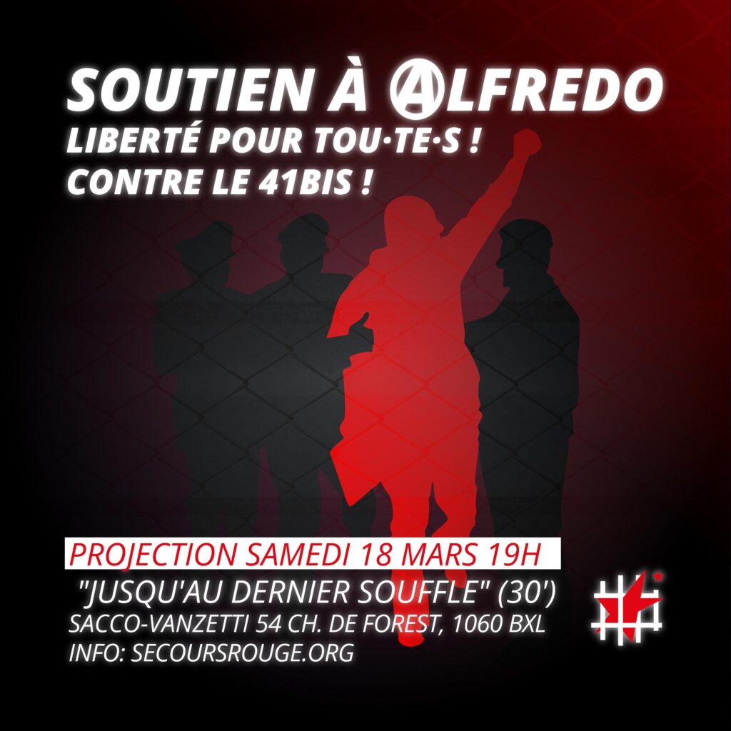 La lutte se focalise maintenant sur la menace d’alimentation forcée. Un procureur a tenu à rappeler qu’il était illégal en Italie d’attenter à ses jours. A l’opposé, des médecins ont rappelé que leur déontologie leur interdisait de poser un acte contre la volonté du patient. Cependant, l’expérience d’autres pays montre que les autorités ont toujours trouvé des médecins complices pour appliquer la nutrition forcée. Le 18 mars, journée international des prisonniers et prisonnières politiques, le Secours Rouge organise une projection du documentaire « Jusqu’au dernier souffle » qui retrace l’histoire judiciaire des militants anarchistes, Alfredo Cospito et Anna Beniamino et permet une meilleur compréhension du régime de torture qu’est le 41 bis. Des camarades seront présent.e.s pour une discussion après la projection.
