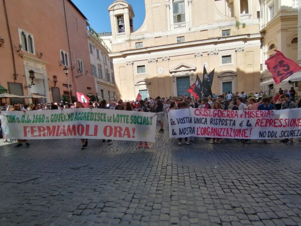 En Italie ont débuté les discussions à la chambre du projet de loi nommé DDL n°1660 Nordio-Piantedosi-Crosetto. Il s’agit du dernier « paquets de sécurité » lancés par le gouvernement Meloni fondés sur l’introduction de nouveaux types de délits et sur le durcissement des sanctions pour celles qui existent déjà. Sont spécifiquement ciblées toutes les formes de lutte qui caractérisent les mouvements de dernières années et actuels. Les piquets de grève ouvrière pourront être condamnés à 4 ans de prison, le blocage des routes et des chemins de fer (jusqu’à 2 ans), l’occupation d’immeubles – pour des logements ou pour la création d’espaces organisés – (jusqu’à 8 ans) avec le risque d’inculpation pour délits associatifs (jusqu’à la finalité de terrorisme), l’abolition des abus de pouvoir pour les agents publics, la prise en charge des frais de justice pour les agents des forces de l’ordre qui commettre des « abus en uniforme »… Un point concerne les actions (manifestations ou sabotages) d’infrastructures publiques définies d’ « intérêt stratégique nationale » comme par exemple la ligne TAV Turin-Lyon et similaires. Dans ce cadre, les condamnations pourraient aller jusqu’à 25 ans de prison. Et ce n’est pas que l’acharnement vis-à-vis d’un mouvement irréductible et puissant, c’est aussi un reflet de la militarisation sociale pour le croissant engagement de guerre.