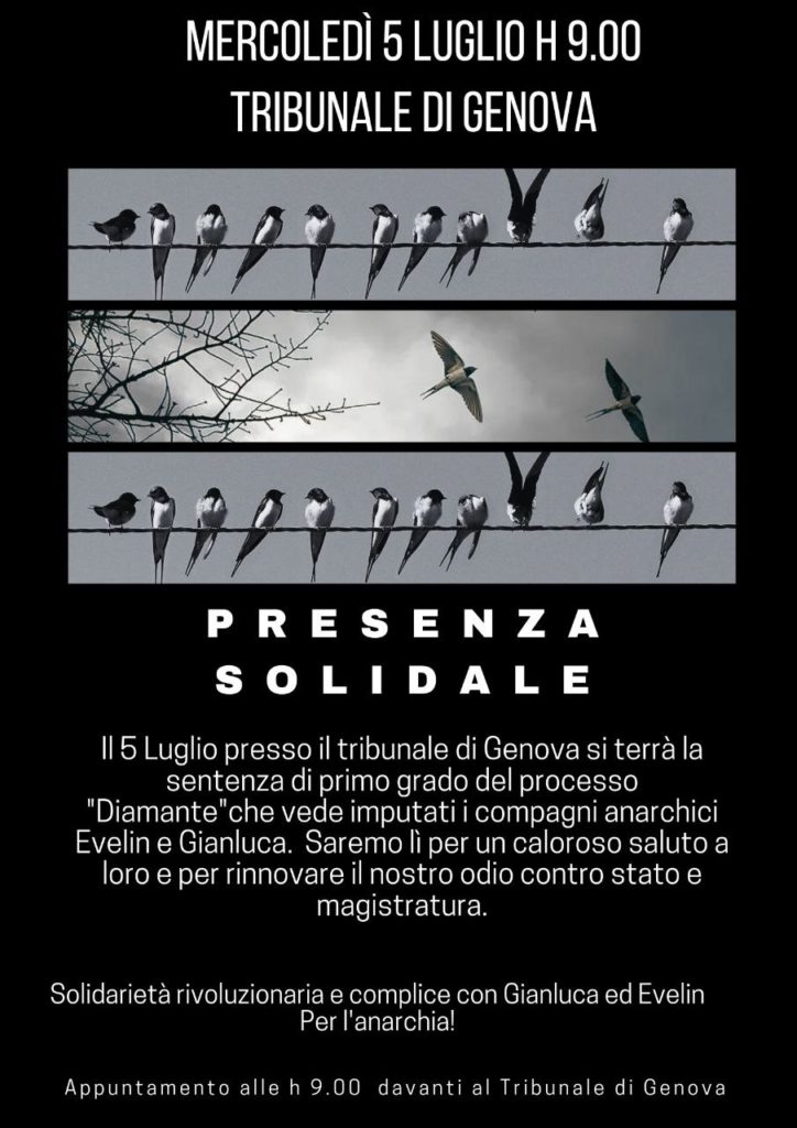 Hier, jeudi 5, le tribunal de Gênes a rendu son jugement en première instance pour le procès « Diamante », contre les compagnons anarchistes Evelin et Gianluca (suite aux arrestations du 16 mars 2022). Evelin a été acquittée de toute accusation et Gianluca a été condamné à 4 ans et 6 mois de prison (en plus de 15 000 euros d’amende), pour « possession illégale d’explosifs » (art. 1 et 2 de la loi n°895/67) et « tentative de délit » (art. 56 du code pénal), alors qu’il a été acquitté de l’accusation de « fabrication ou possession de matériel explosif, dans le but de porter atteinte à la sécurité publique » (art. 435 du code pénal). La circonstance aggravante de la « finalité de terrorisme ou de subversion de l’ordre démocratique » (en relation avec l’art. 270 bis, §1 du code pénal), envisagée pendant l’enquête, n’a pas été retenue. Le parquet avait demandé 5 ans et 6 mois de prison (en plus de 15 000 euros d’amende) pour Evelin et 9 ans et 6 mois (et 30 000 euros) pour Gianluca. Ce dernier est toujours aux arrestations domiciliaires avec toutes les contraintes.