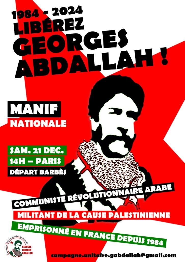 L’audience décisive (en appel) pour la libération de Georges Abdallah aura lieu le jeudi 19. C’est le samedi 21 décembre, entre cette audience et le prononcé, qu’une journée internationale d’action aura lieu. Un appel à été lancé pour une large participation à une manifestation à Paris et pour des rassemblements et des actions solidaires dans les pays voisins de la France.