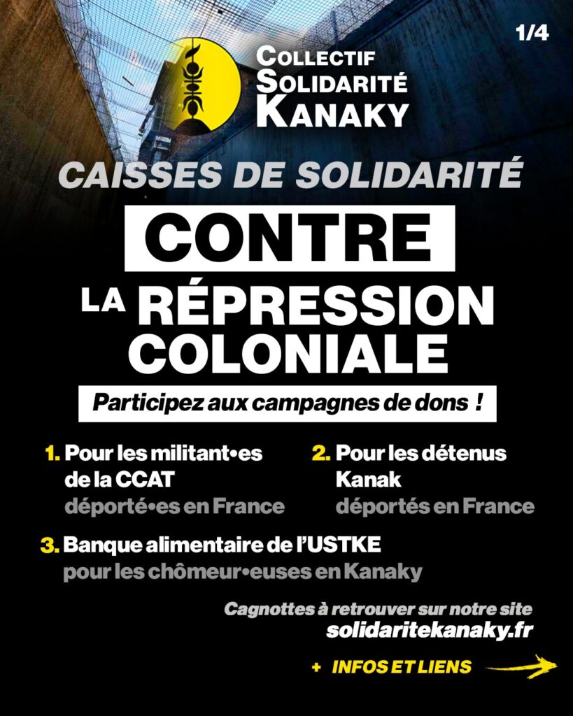Le collectif Solidarité Kanaky a mis en place plusieurs caisses de solidarité pour soutenir les militant·es Kanak de la CCAT récemment libéré·es pour assurer des frais du quotidien (hébergement, recherche d’un travail, etc.) durant leur assignation à résidence, mais également en soutien à l’ensemble des détenus Kanak du Camp Est qui ont été déportés en France.