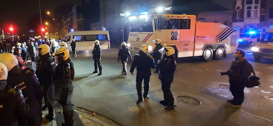 Une manifestation ce samedi soir à Liège a ressemblé autour de 500 personnes. Celle-ci entendait dénoncer le caractère anti-social des mesures sanitaires. Cette manifestation fait suite à une autre mobilisation du même type la semaine passée (voir notre article ici). A la fin de la manifestation, la police locale et le corps d’intervention fédéral appuyé par deux autopompes ont nassé la manifestation. Suite à cela, environ 350 personnes ont été arrêtées administrativement mais relâchés directement (des PV’s pour bris du couvre feux sont en cours de rédaction, ceux-ci ne viseront pas que les personnes arrêtées mais toutes les personnes identifiées). Cependant 17 personnes ont été placée en détention administrative suite à une tentative de percer la nasse policière. De plus, il y aurait eu 3 arrestations judiciaires : 2 pour rebellions et 1 pour dégradation. On dénombre par ailleurs 7 personnes blessées (3 manifestants et 4 policiers).