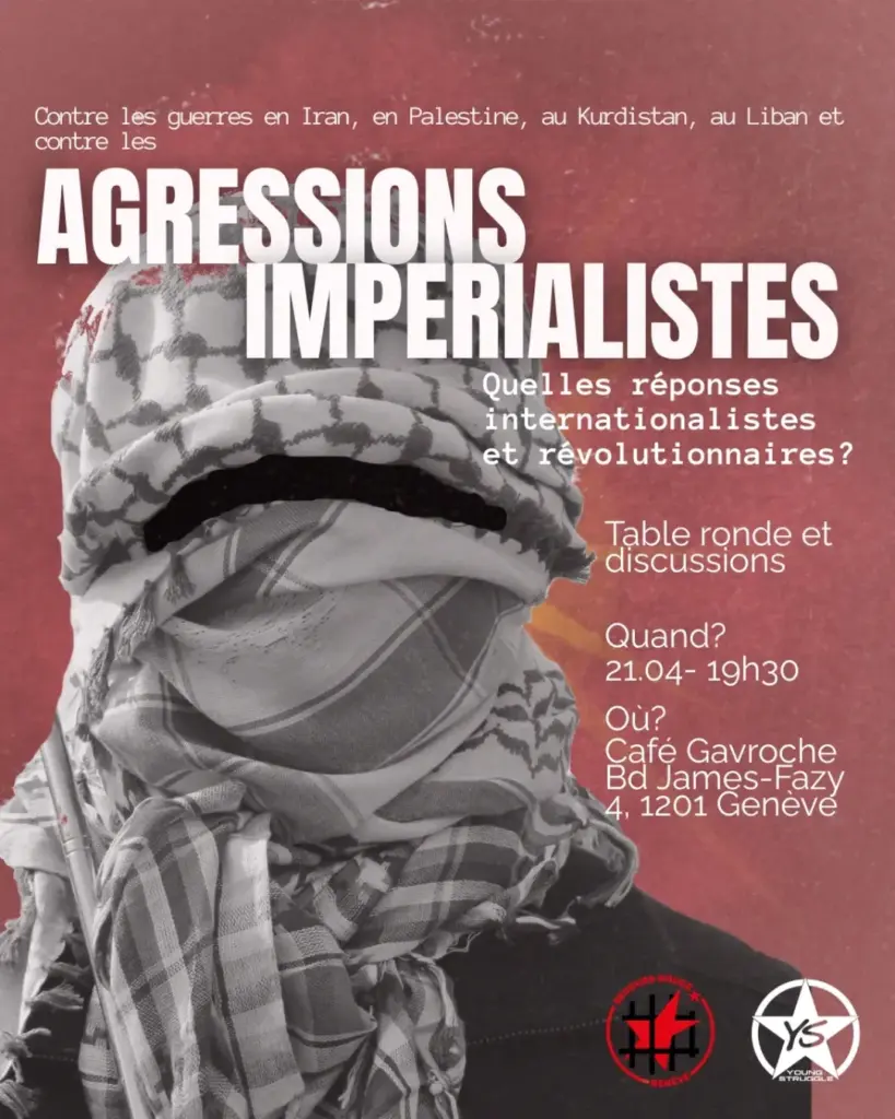 Lors de cette table ronde, des camarades de Young Struggle, du Secours Rouge Genève et du mouvement révolutionnaire kurde partagerons leurs réflexions et analyses sur les derniers développements des guerres impérialistes au Moyen-Orient et présenterons leur travail en cours sur la question. Une seconde partie laissera la place aux questions et aux échanges.