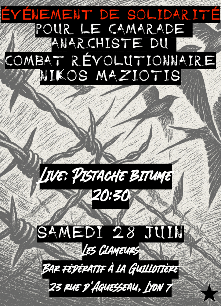 Des personnes solidaires organisent un concert de soutien à Nikos Maziotis, prisonnier politique en Grèce et militant anarchiste de Lutte Révolutionnaire, suite au rejet de sa demande de libération et à la prolongation de sa détention. Pour la sixième fois, la justice a refusé sa demande de libération conditionnelle (voir notre article), bien qu’il ait dépassé les 3/5 de sa peine depuis 2022, comme le prévoit les « lois » pour tous les détenus·es. En Grèce, il est le seul prisonnier politique avec une peine fusionnée de 20 ans — donc pas à perpétuité — à vivre cette situation, simplement parce qu’il n’a pas montré de « repentir » ni de « réforme morale ». Ancienne prisonnière politique et cofondatrice de Lutte Révolutionnaire, Pola Roupa interviendra par téléphone lors de cette soirée.